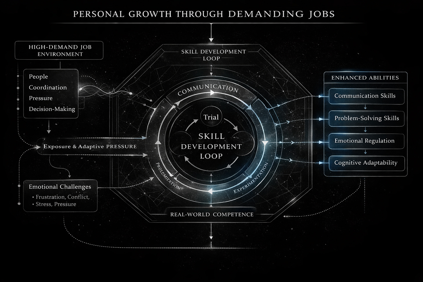 Working inside jobs, especially those involving people, coordination, pressure, or decision-making, forces individuals to develop communication, problem-solving, emotional control, and pattern recognition skills.