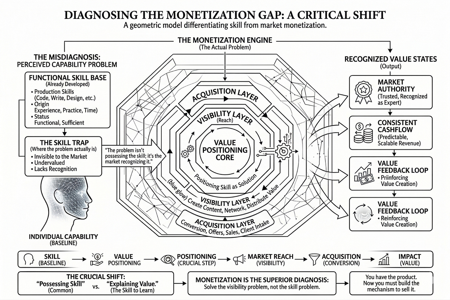 Monetization is the ability to take that capability and convert it into a clear, exchangeable form. Without this second layer, skills remain internal and unstructured. They exist, but they are not visible, not articulated, and not accessible to the market. As long as capability stays embedded inside experience, it cannot be evaluated externally. And if it cannot be evaluated, it cannot be paid for.